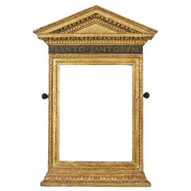 in legno laccato dorato ed intagliato, di forma architettonica ad edicola, il frontone di forma classica aggettante e intagliato a baccellature e unghiature, presenta iscrizione SANTO SANTORUM sul fregio, battuta liscia che si porta su fascia a fogliette riposante su base aggettante e decorata a fogliette d’acanto; ingombro cm 56,5x39, luce cm 30,2x22,8