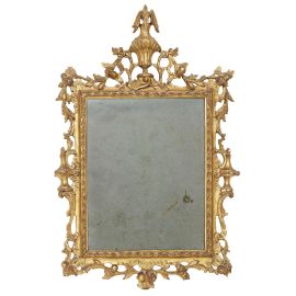 in legno intagliato e dorato, battuta liscia su bordo a doppio nastro incrociato interamente contornato da intaglio a giorno a rami fioriti inframezzati da vasi ai lati che dal centro inferiore si portano a quello superiore a inquadrare la cimasa a motivo di vaso e racemi, montate a specchio; ingombro cm 60,5x40,5, luce cm 31,8x25