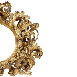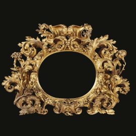 in legno intagliato e dorato, di forma ovale, battuta di linea curva interamente contornata da motivo a foglie, fiorellini e bacche impreziosita da ricco intaglio a giorno a motivo di girali che da mascherone al centro inferiore si sviluppa lungo tutto il perimetro a grandi girali e fiori aperti per poi rinchiudersi nella cimasa con grandi volute; ingombro cm 80x112, luce cm 41x50