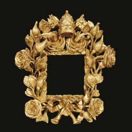 in legno intagliato e dorato, battuta interamente contornata da ricco intaglio a giorno a tutto tondo che dal centro inferiore raffigurante fiocco si sviluppa in rose, racemi e boccioli fino alla cimasa composta da triregno entro chiavi sopra coppia di fiori ricadenti a voluta; ingombro cm 35x32, luce cm 12,4x11,8