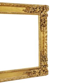 in legno intagliato e dorato, piccola battuta su fascia rilevata intagliata a boccioli ricorrenti che si dipartono da nastri posti ai centri e si portano su grande fascia liscia impreziosita agli angoli da ricco intaglio a giorno a motivo di racemi e foglie e grande profilo a nastro ritorto, scende a parete con gola e modanature; ingombro cm 197x167, luce cm 148,8x119