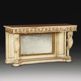 in legno laccato e dorato, piano in marmo sotteso da fascia con decori dorati a palmette e vasi fioriti, sostenuto da montanti anteriori in foggia di teste leonine terminanti in grande zampa, la parte parietale inferiore arricchita da specchiera, su base di linea sagomata, cm 90x162x57,5
