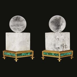 in cristallo di rocca poggianti su base cubica ed ulteriore base in malachite con montatura in bronzo, piedini a trottola, alt. cm 31