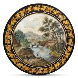 di forma circolare, piano in scagliola raffigurante paesaggio campestre con fiume entro ghirlanda di racemi con ghiande, poggiante su struttura in legno di ciliegio parzialmente laccato e dorato, su base sagomata, alt. cm 77, diam. cm 84