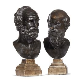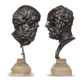 Tuscan, first half 18th century, Socrates and Demosthenes, patinated bronze on marble bases, h. 56 and 58 cm (overall)