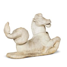 scultura in marmo, probabile elemento di fontana, raffigurante animale con corpo di cavallo e coda di pesce su base ad imitare il mare, cm 61x90x35