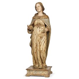 Northern Italian, 16th century, The Virgin announced, carved and painted wood,133x47x43 cm, on a wooden marble-like painted base (base 60x53x53 cm)