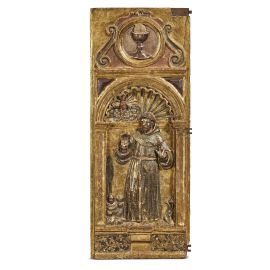 Northern Italian, 17th century, St. Francesco, A part of a door, carved gilt and painted wood, 89x36x3,5 cm