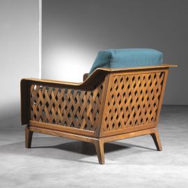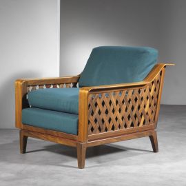 A PAIR OF ARMCHAIRS, BRAIDED WOOD STRUCTURE, GREEN FABRIC UPHOLSTERED CUSHIONS