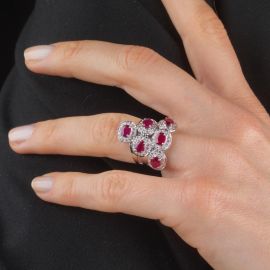in oro bianco 18kt, impreziosito da rubini taglio ovale per ct 2 circa e da diamanti taglio brillante per ct 0.80 circa, mis. 52, gr. 7