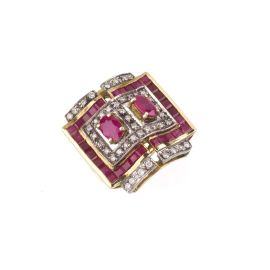 in oro 14kt, dal profilo ondulato, impreziosito da rubini taglio ovale e carré per ct 3.90 circa e diamanti taglio brillante per ct 0.80 circa, punzone 585, mis. 57, gr. 18