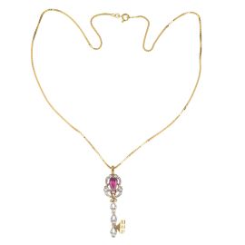 in oro giallo e bianco 18kt, pendente impreziosito da un rubino taglio a goccia di ct 2.20 circa e da diamanti taglio brillante e huit huit per ct 0.20 circa, punzone 750 e del fabbricante, dim. cm 1x5, gr. 12