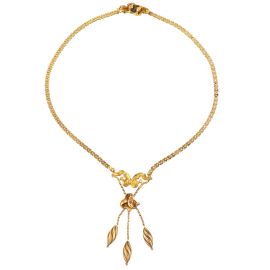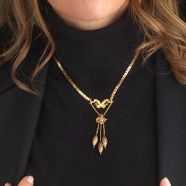 in oro giallo 18kt e oro a basso titolo, composta da una serie di maglie geometriche con al centro un motivo a volute da cui pende un elemento a frange cesellate, dim. pendente cm 7,5, lungh. collana 43, gr. 13