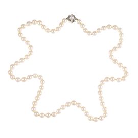 composta da un filo di perle di mm 7 circa, fermatura in oro 14kt impreziosita da diamanti taglio huit huit per ct 0.10 circa, punzone 585, lungh. cm 69,5, gr. 53