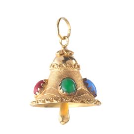 in oro giallo 18kt, collana con pendente impreziosito da pietre sintetiche incolore, punzoni 750 e del fabbricante, chiusura a moschettone, lungh. cm 58, accompagnata da un ciondolo a forma di campanella, circondato da pietre colorate taglio cabochon, dim. cm 2,5x3,5, gr. 15 complessivi