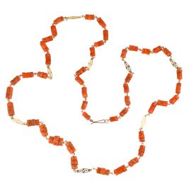 fermatura e distanziali in oro 9kt, composta da una serie di cilindri in corallo digradanti da mm 12x6 a 6x3 circa uniti in gruppi di tre, lungh. cm 44, gr. 70