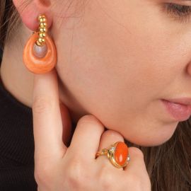 composta da un paio di orecchini in oro giallo e bianco 18kt con creole in corallo pendenti (difetti) e da un anello in oro giallo e bianco 18kt con al centro un corallo taglio cabochon affiancato da due diamanti taglio brillante per ct 0.10 circa, mis. 53, punzoni 750 e del fabbricante, dim. orecchini 2x3,5 circa, chiusura a clip, gr. 27 complessivi