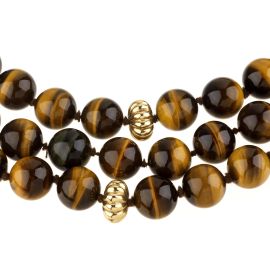 composta da tre fili di sfere in occhio di tigre digradanti di mm 17-10 circa, fermatura e distanziali in oro giallo 18kt, punzone 750, lungh. cm 52, gr. 530