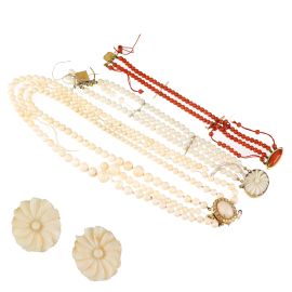 collana a due fili di sfere in corallo rosa digradanti di mm 11-6 circa, con fermatura in oro giallo 18kt e diamanti taglio huit huit; un bracciale a quattro fili di sfere in corallo rosa di mm 6 circa, fermatura in oro giallo 18kt; un bracciale a quattro fili di sfere in corallo rosso di mm 4 circa, fermatura in oro giallo 18kt, gr. 147 complessivi; accompagnati da un paio di orecchini a forma di grandi fiori in corallo rosa inciso con chiusura a clip in oro giallo 18kt, punzone 750, dim. cm 3x3,5, gr. 27 complessivi