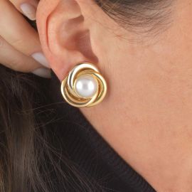 in oro tre colori 18kt, reallizzati con un motivo a tre anelli intrecciati che trattengono al centro perle mabé di mm 11x5 circa, punzoni 750 e del fabbricante, dim. cm 2,5x2,5, chiusura a clip, gr. 11 complessivi