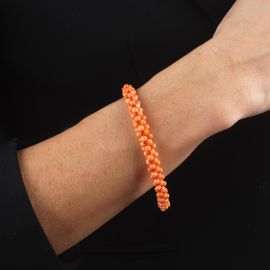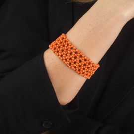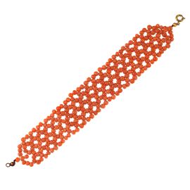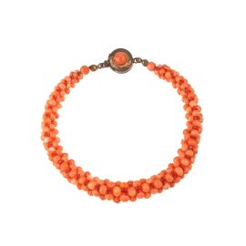 uno realizzato a maglia tubolare con microsfere in corallo, chiusura a moschettone in metallo, lungh. cm 19,5; un secondo bracciale con piccoli barilotti lievemente sfaccettati in corallo disposti a maglia tessita, chiusura a moschettone in metallo, lungh. cm 19; un terzo bracciale composto da microsfere in corallo disposti a maglia tessita tubolare, fermatura in metallo, lungh. cm 19, gr. 50 complessivi