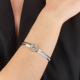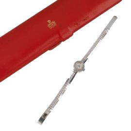 cassa in oro bianco 18kt, quadrante argenté, indici applicati, lunetta con diamanti taglio huit huit per ct 0.20 circa, movimento a carica manuale, bracciale integrato in oro bianco 18kt impreziosito da diamanti taglio huit huit per ct 0.40 circa, punzoni 750 e 18kt, lungh. cm 14, gr. 28. Corredato di scatola.