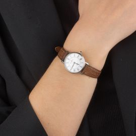 cassa in acciaio, fondello a scatto, lunetta a scalino, corona con pietra cabochon blu, quadrante bianco firmato Baume & Mercier, numeri romani, movimento al quarzo, cinturino in pelle, fibbia in metallo, vetro minerale. Diam. mm 25