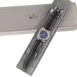 cassa in acciaio, fondello serrato con viti, lunetta liscia in acciaio, quadrante blu con indici piccoli brillanti, firmato Buti, secondi a ore otto, movimento a carica automatica, cinturino in pelle, fibbia in acciaio firmata Buti, vetro minerale. Diam. mm 38