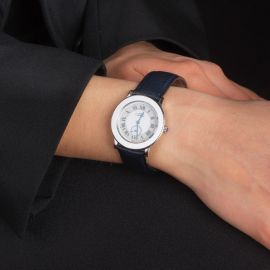 cassa in argento sterling, punzone 925, fondello serrato con viti, lunetta liscia, corona con pietra blu, quadrante bitonale grigio/bianco, numeri romani stampati, secondi a ore sei, movimento al quarzo, cinturino in pelle originale, boucle deployant in acciaio firmata Cartier, vetro minerale, gr. 48. Diam. mm 33