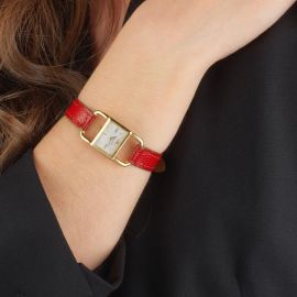 cassa di forma rettangolare in oro giallo 18kt, quadrante argenté con logo applicato, grafica di colore nero, indici oro applicati, movimento a carica manuale, cinturino in pelle rossa, fibbia in metallo dorato, vetro minerale. Dim. mm 20x35