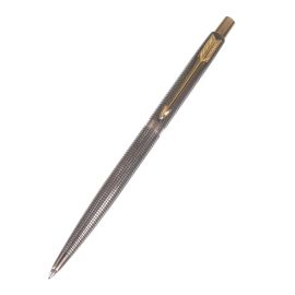 costituito da una penna Parker a sfera dal fusto cesellato in metallo argentato, dettagli finiture in metallo dorato, fermaglio con emblema Parker a freccia, caricamento a cartuccia, lungh. cm 13.