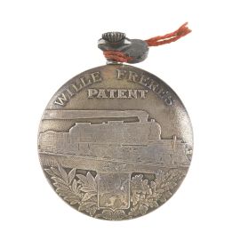 cassa in metallo finemente decorata a motivi fogliacei con locomotiva, leone rampante e firma in rilievo Wille Freres, quadrante bianco, numeri romani a smalto nero, numeri arabi in rosso, secondi a ore sei, movimento a carica manuale, vetro plastica, gr complessivi 100. Diam. mm 53