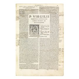 BEAUTIFUL EDITION ILLUSTRATED WITH LARGE XYLOGRAPHS that vividly depict scenes and protagonists of Virgil’s works and in some cases Virgil himself. -- The title page has a restored margin with a small loss, small holes, old signatures written on the front and back. Small worm trails with minimal losses on subsequent leaves, top edge trimmed, some pale water stain, a dark stain at the top corner of two ll., tear on ll. 184 and 345, cut on ll. 204-206, portion of margin removed from ll. 265, 273 359 (without text loss), worm trail in the lower white margin of the 3e-3f quires. Lacks three final ll. 3p2-3p5 with the Priapea, 3p1 and 3p6 restored in the margins and perhaps coming from another copy, ancient annotations on the reverse of the last leaf. Detailed description and additional images upon request.