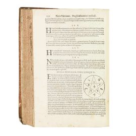 In folio (310 x 215 mm). [xxiv] 919 [1] pp. Numerose vignette xilografiche nel testo. Mezza pelle settecentesca con angoli, dorso liscio con tassello e fregi dorati, tagli spruzzati in rosso. -- Frontespizio e primo fascicolo sciupato e gualcito: in particolare, il frontespizio è risarcito nella parte inferiore con perdita di testo, presenta un foro e numerosi piccoli timbri; alle pagine seguenti compaiono due firme di appartenenza risalenti al Seicento; ricorre accanto ai titoli un timbretto nobiliare; carte A3-A6 con margine esterno lacunoso, X6 (p. 252) con strappo restaurato, galleria di tarlo al margine interno di un paio di fascicoli, margine della carta Iii5 (p. 658) con lacune, qualche occasionale fioritura, brunitura e macchietta.