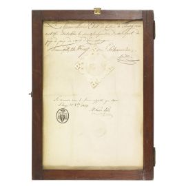 Lot of 2 Napoleonic letters that includes: 1) A signed autograph letter by Napoleon, 2 pages, dated “Paris, le 20 février 1813”, addressed to General Jacques Jean Alexandre Bernard Law de Lauriston (1768-1828) in Magdeburg (during the Russian campaign). In it the Emperor informs the General of the military forces he will find in that city and gives him instructions for their organization. The letter is mounted within passe-par-tout and framed (approx. 370 x 325 mm). 2) A letter in folio in which the death of Ortensia de Beauharnais (1783-1837), Napoleon's stepdaughter, is recorded, dated 12 October 1837, with wax and paper seals, preserved in a wooden box (365 x 267 mm) with front and back glass.