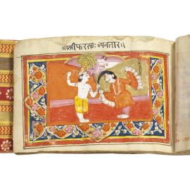 PRECIOUS HINDUIST SPRITUAL MANUSCRIPT WITH INTENSE CHROMATISMS. Manuscript of the Bhagavadgītā (or Bhagavad Gita) in classical Sanskrit. India, probably Kashmir, 19th century. [270] leaves that include [16] full-page miniatures, [20] framed pages and [17] blank leaves (11 of which to protect the plates). -- It was not possible to compare the copy with another digitized one and therefore the total number of leaves and plates is not known; some miniatures show abrasions; traces of use and time. Detailed description and additional images upon request.