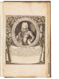 In folio (420 x 255 mm). 208 pp. decorate con iniziali e fregi xilografici (assente l’ultima carta χ¹, qualche macchietta occasionale, qualche carta pallidamente brunita), frontespizio calcografico disegnato da Giulio Cesare Grampino e inciso da George Tasniere (montato su cartoncino, ingiallito e con piccola mancanza ad un angolo - senza perdite), 34 ritratti calcografici incisi da George Tasniere, Pierre Giffart e altri (tavola tra le pp. 146-147 con restauro al margine, altre tavole pallidamente brunite). Testo in latino seguito da traduzione in francese. Pergamena rigida moderna (difetti) con tassello in marocchino rosso al piatto anteriore, sguardie rinnovate. Provenienza: scritta di appartenenza di un conte Jacopo Filiberto datata 1768 al frontespizio, altra più tarda nota a matita, ex libris inciso con motto “Tovs jovrs havt - Barbanetae Comes”, timbro moderno di “Silvestri Enrico” restauratore e legatore in Firenze.