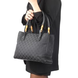 In Original GG nero con rifiniture e base in pelle. Metalleria in metallo color argento inclusi i piedini alla base. Doppio manico lungo con nottoli di bamboo all’attacco. Interno con doppio scomparto aperto e tasca centrale con zip.