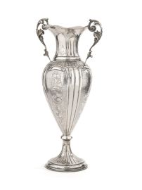 VASO, SECOLO XXin argento, base circolare su cui poggia il corpo decorato da scanalature e volute di foglie, due anse, alt. cm 52, g 1630