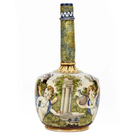 in maiolica dipinta in policromia, forma arrotondata con spalla molto piana e collo cilindrico portato alto, base appena sottolineata. Il decoro vede sul corpo una elaborazione dei motivi “castellani” con putti inseriti in paesaggio arcadico, mentre il collo è decorato a piccole squame; alt. cm 25, diam. piede cm 8,8