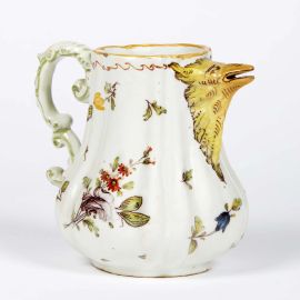 in maiolica dipinta in policroma a gran fuoco, corpo baccellato con ansa a doppia C e imboccatura a becco di grifo. Il decoro presenta un grande bouquet di fiori e semis minori, con tocchi di verde sull’ansa. La caffettiera è priva di coperchio; cm 15,8x18x12,8