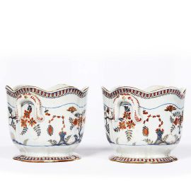 in maiolica, forma cilindrica con orlo sagomato e doppia presa a staffa aderente al corpo, poggianti su piede a calice basso ed estroflesso. I rinfrescatoi presentano una decorazione floreale in stile orientale con elementi floreali, rocce e vasi cinesi secondo la tricromia Imari; cm 26x20,6x13,5