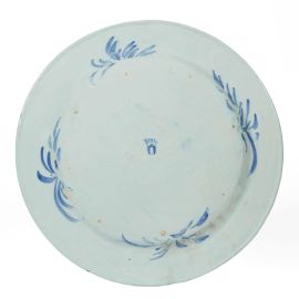 in maiolica dipinta in monocromia blu. Il decoro, noto come “a tappezzeria” con cespi di piante e rocce, vede al centro della composizione una architettura di fantasia con archi e colonne. Marca sul retro; diam. cm 45,8