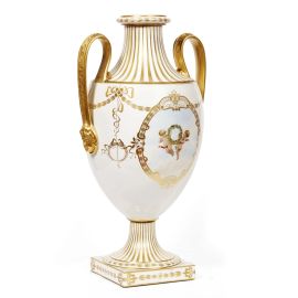 in porcellana, corpo ad anfora su piede a calice con doppia ansa fermata da mascherone, dipinto in policromia con scene e personaggi in medaglioni e con ghirlande e decori in oro. Marca GINORI in verde sotto il piede; cm 59,5x32x26