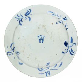 in maiolica dipinta in monocromia blu: al centro grande emblema con pesce e tre stelle, tesa decorata “alla tappezzeria” con galeoni; sul retro marca stemma di Savona; diam. cm 36,2, alt. cm 3,6