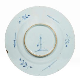 in maiolica dipinta in monocromia azzurra, cavetto piano e larga tesa, presenta un decoro “a tappezzeria” con putto che sorregge un pomo su fondo azzurrato. Marca lanterna sul fondo; diam. cm 31,2, alt. cm 4,6