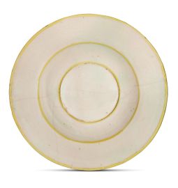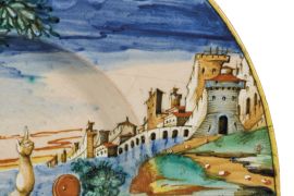 in maiolica dipinta in policromia, cavetto profondo e larga tesa orizzontale, poggiante su un cercine ad anello. La scena raffigura un gruppo di personaggi, vestiti con lorica, in cammino verso una città turrita, riferimento probabilmente all’episodio dell’Eneide nel quale Enea e i compagni si avviano verso Cartagine e l’eroe, inconsapevole, porta con sé Cupido credendolo il figlio Ascanio. L’opera, dipinta con una certa maestria, è vicina per stile alla produzione della bottega Merlino attorno agli anni quaranta del Cinquecento. Un confronto stilisticamente e tecnicamente pertinente ci deriva da un piatto conservato al Metropolitan Museum di New York che raffigura l’eroismo di Marco Curzio. Il confronto tra le architetture collocate sullo sfondo, sempre in posizione elevata, sulla tesa, delle nuvole a chiocciola dipinte in blu cobalto e soprattutto le modalità stilistiche nel delineare i personaggi con gambe allungate, caviglie sottili, corpi anch’essi allungati con teste piccole, e la presenza di un personaggio di spalle con scudo allungato sono tutti elementi che ci confortano nell’attribuzione; diam. cm 28,5, diam. piede cm 10,4, alt. cm 3,8