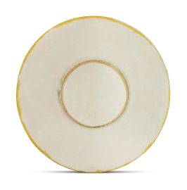 in maiolica dipinta in policromia, cavetto poco profondo e larga tesa. Al centro campeggia una figura femminile nell’atto di incedere portando un canestro di frutta nella mano destra; diam. cm 19,8, diam. piede cm 8,5, alt. cm 2,2