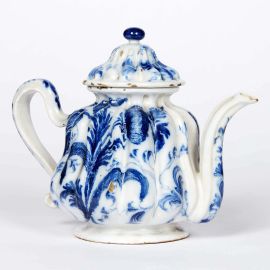 in maiolica, corpo fortemente costolato con ansa sagomata e cannello aggettante, coperchio costolato sormontato da pomello a bottone. La forma trova riscontro in un esemplare di Ca’ Rezzonico a Venezia, mentre il decoro in monocromia blu con tulipani prossimi alla nota lastra sottofinestra datata “nove 1751”; cm 17x21,5x12,8