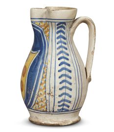 in maiolica dipinta in policroma nei toni del blu, verde, giallo, arancio, corpo di forma ovoidale, collo a bocca trilobata e ansa a nastro verticale. Sul fronte, entro un medaglione, uno scudo mediceo circondato da motivi a griglia puntinata; diam. bocca cm 10,4, diam. base cm 10,8, alt. cm 23,5